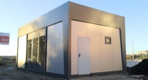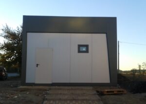 Стены выполняются из трехслойных структурных сэндвич-панелей, которые устанавливаются вертикально. Сэндвич-панели состоят из трех функциональных слоев – это слой наполнителя для тепло и звукоизоляции, а также два наружных слоя для формирования защиты от воздействия внешней среды и обеспечения жесткости конструкции. Два внешних слоя состоят из оцинкованного металла, покрытого слоем полимера по шкале RAL. Толщина слоя наполнителя зависит от конкретных климатических и других условий, в которых будет использоваться строительное сооружение и может быть 100 – 300 мм.