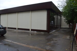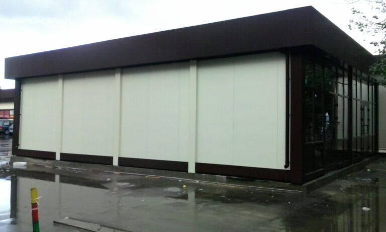Стены кафе выполняются из трехслойных структурных сэндвич-панелей, которые устанавливаются вертикально. Сэндвич-панели состоят из трех функциональных слоев – это слой наполнителя для тепло и звукоизоляции, а также два наружных слоя для формирования защиты от воздействия внешней среды и обеспечения жесткости конструкции. Два внешних слоя состоят из оцинкованного металла, покрытого слоем полимера по шкале RAL. Толщина слоя наполнителя зависит от конкретных климатических и других условий, в которых будет использоваться строительное сооружение и может быть 100 – 300 мм.