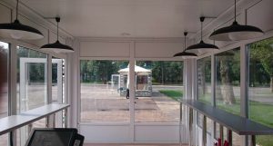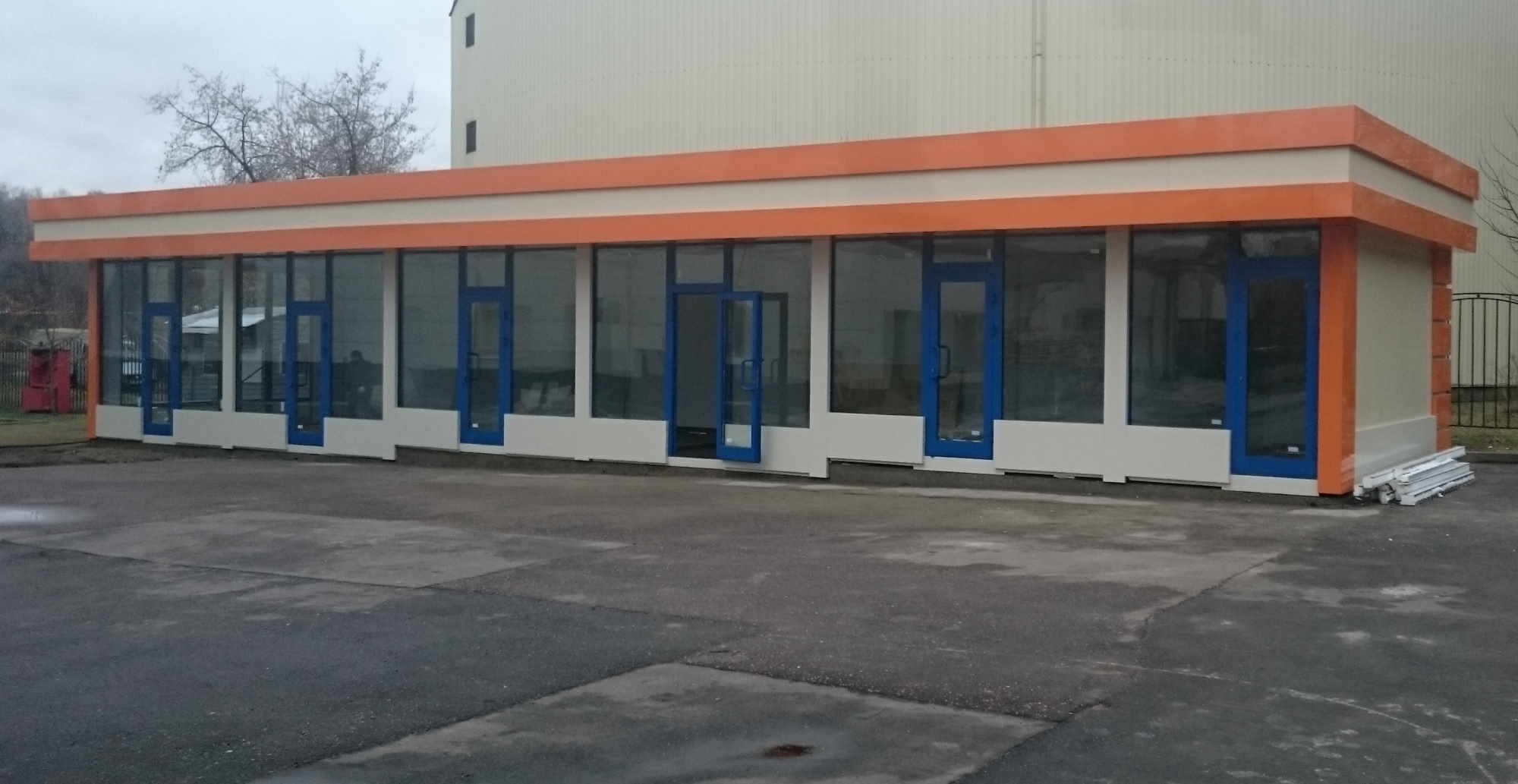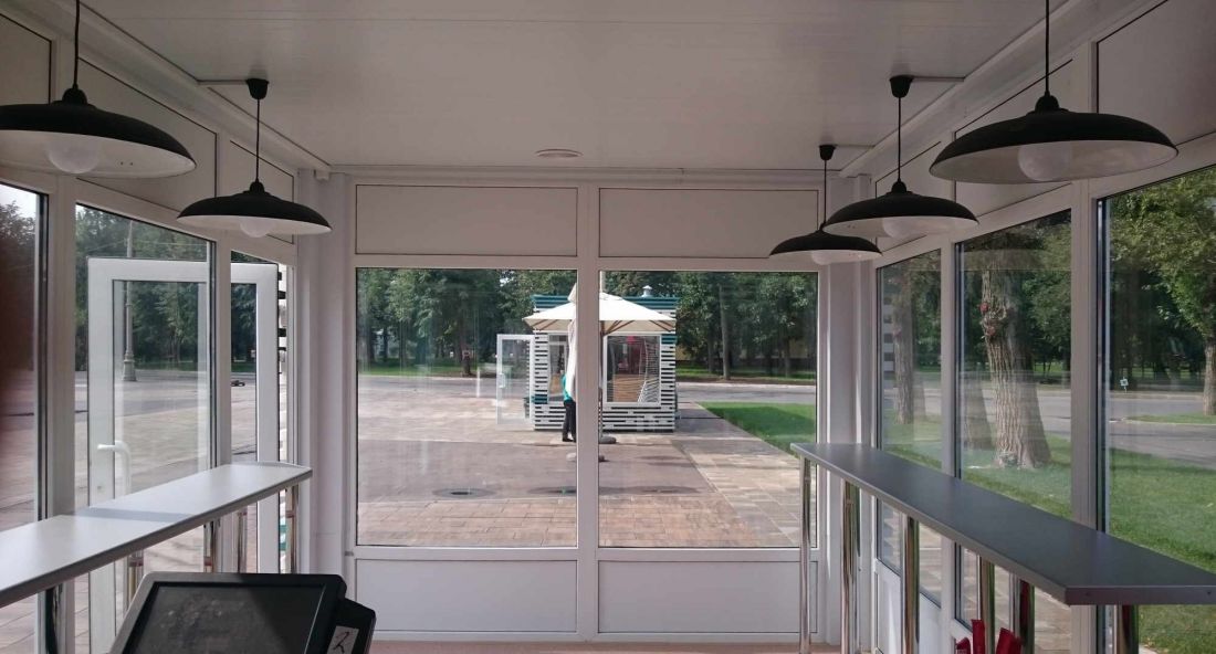 Стены кафе выполняются из трехслойных структурных сэндвич-панелей, которые устанавливаются вертикально. Сэндвич-панели состоят из трех функциональных слоев – это слой наполнителя для тепло и звукоизоляции, а также два наружных слоя для формирования защиты от воздействия внешней среды и обеспечения жесткости конструкции. Два внешних слоя состоят из оцинкованного металла, покрытого слоем полимера по шкале RAL. Толщина слоя наполнителя зависит от конкретных климатических и других условий, в которых будет использоваться строительное сооружение и может быть 100 – 300 мм.