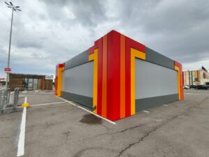 Стены быстровозводимых магазинов выполняются из трехслойных структурных сэндвич-панелей, которые устанавливаются вертикально. Сэндвич-панели состоят из трех функциональных слоев – это слой наполнителя для тепло и звукоизоляции, а также два наружных слоя для формирования защиты от воздействия внешней среды и обеспечения жесткости конструкции. Два внешних слоя состоят из оцинкованного металла, покрытого слоем полимера по шкале RAL. Толщина слоя наполнителя зависит от конкретных климатических и других условий, в которых будет использоваться строительное сооружение и может быть 100 – 300 мм.